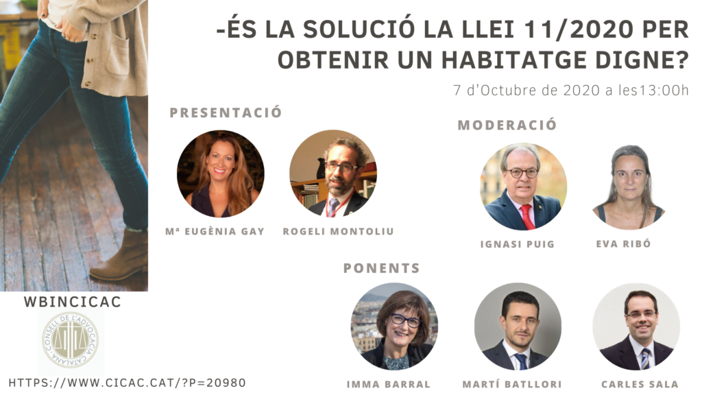 Ens plau informar-vos que la Presidenta del Consell de l’Advocacia Catalana, Excma. Sra. Mª. Eugènia Gay, la Comissió de Normativa del CICAC/ICAB i la Comissió de Formació del CICAC, han organitzat un nou WbinCICAC que, sota el títol “-És la solució la Llei 11/2020 per obtenir un habitatge digne?” es celebrarà el dimecres, 07 d’Octubre d’enguany, de 13:00 a 15:00 hores, en format on-line a través de la plataforma digital ZOOM.