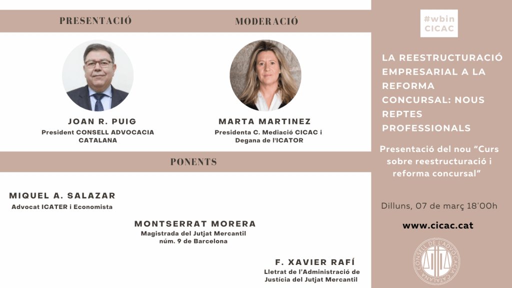 Ens plau informar-vos que el Consell de l’Advocacia Catalana ha organitzat un nou WbinCICAC, el qual porta per títol: sobre els “La reestructuració empresarial a la reforma concursal: Nous reptes professinals. Presentació del nou curs sobre reestructuració i reforma concursal”, el qual se celebrarà el dilluns 7 de març de 2022 de 18 hores fins a les 19.30 hores, en format línia mitjançant la plataforma digital “ZOOM”.