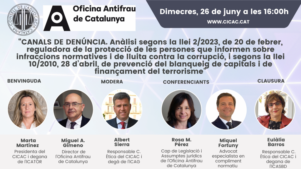 Vídeo. WbinCICAC: Canals de denúncia. Anàlisi segons la llei 2/2023, de 20 de febrer, reguladora de la protecció de les persones que informen sobre infraccions normatives i de lluita contra la corrupció, i segons la llei llei 10/2010, 28 d’ abril, de prevenció del blanqueig de capitals i de finançament del terrorisme