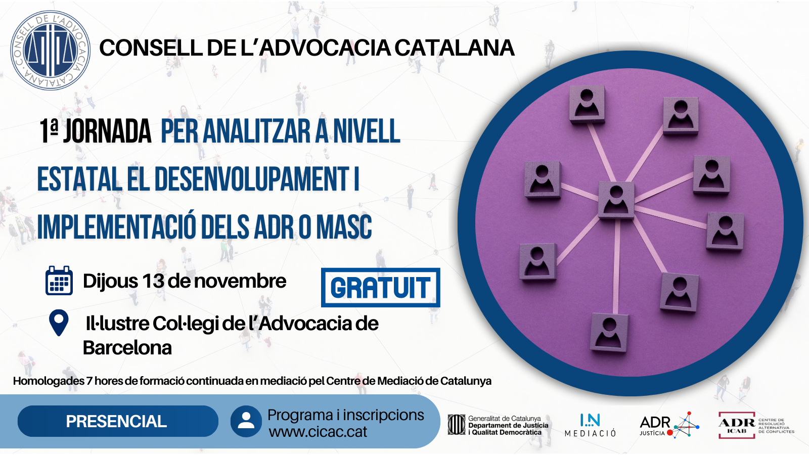 Organitza: Consell de l’Advocacia Catalana amb la col·laboració del Col·legi de l’Advocacia de Barcelona i el suport del Centre de Mediació de Catalunya, del Departament de Justícia i Qualitat Democràtica.
