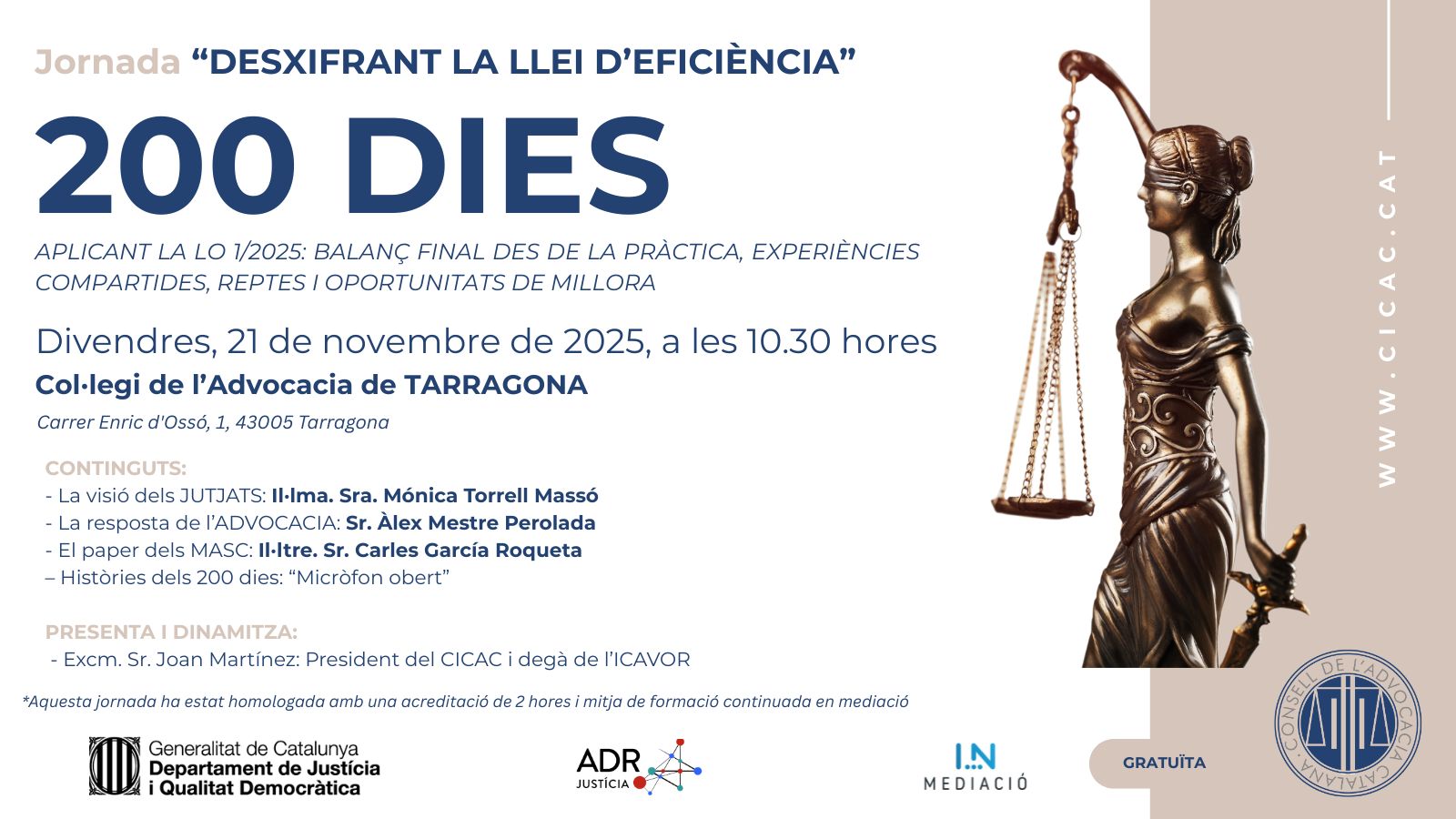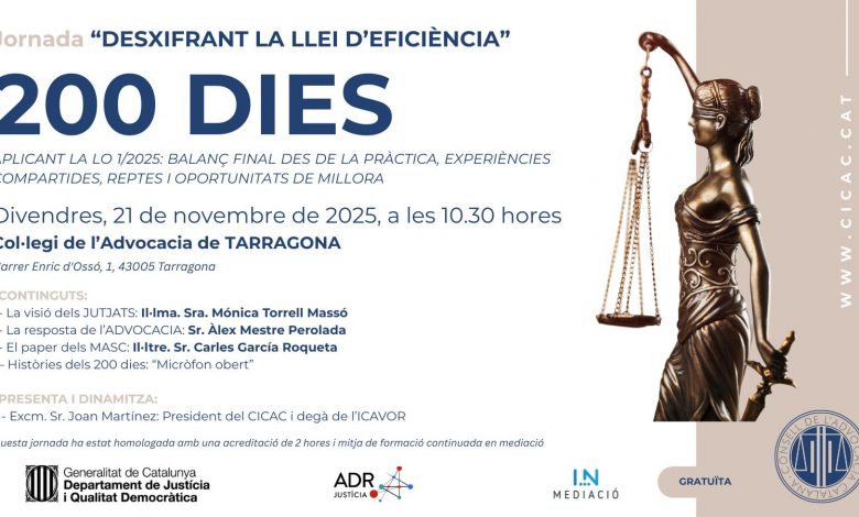 Emmarcada en el projecte “Desxifrant la Llei d’Eficiència”, aquesta jornada final té com a objectiu fer balanç dels primers 200 dies d’aplicació de la Llei Orgànica 1/2025, posant el focus en l’impacte pràctic que està tenint sobre la feina quotidiana de l’advocacia en els seus despatxos, i en els jutjats.