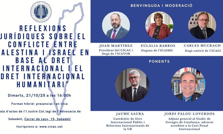 La comissió de Drets Humans d’aquest Consell de l’Advocacia Catalana amb la col·laboració de l’Il·lustre Col·legi de l’Advocacia de Sabadell, organitzen aquesta taula rodona que vol abordar des d’una mirada jurídica els orígens del conflicte a Palestina des del Dret Internacional i el Dret Internacional Humanitari i tractar temes com dret a l’autodeterminació, les resolucions del Consell de Seguretat de NNUU així com també els procediments que avui en dia hi ha oberts davant el Tribunal Penal Internacional i el Tribunal Internacional de Justícia, aclarint les competències de cadascun.