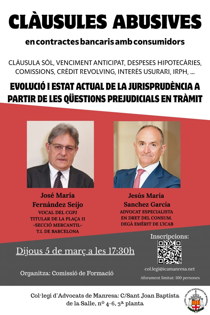 Des de la Comissió de Formació de l’Il·lustre Col·legi d’Advocats de Manresa, ens complau anunciar-te que el proper dijous dia 5 de març de 2026, a partir de les 17.30 hores es celebrarà una conferència sobre CLÀUSULES ABUSIVES en contractes bancaris amb consumidors, en format presencial a la Sala d’actes del Col·legi d’advocats de Manresa (C/ St. Joan Bpta. La Salle).