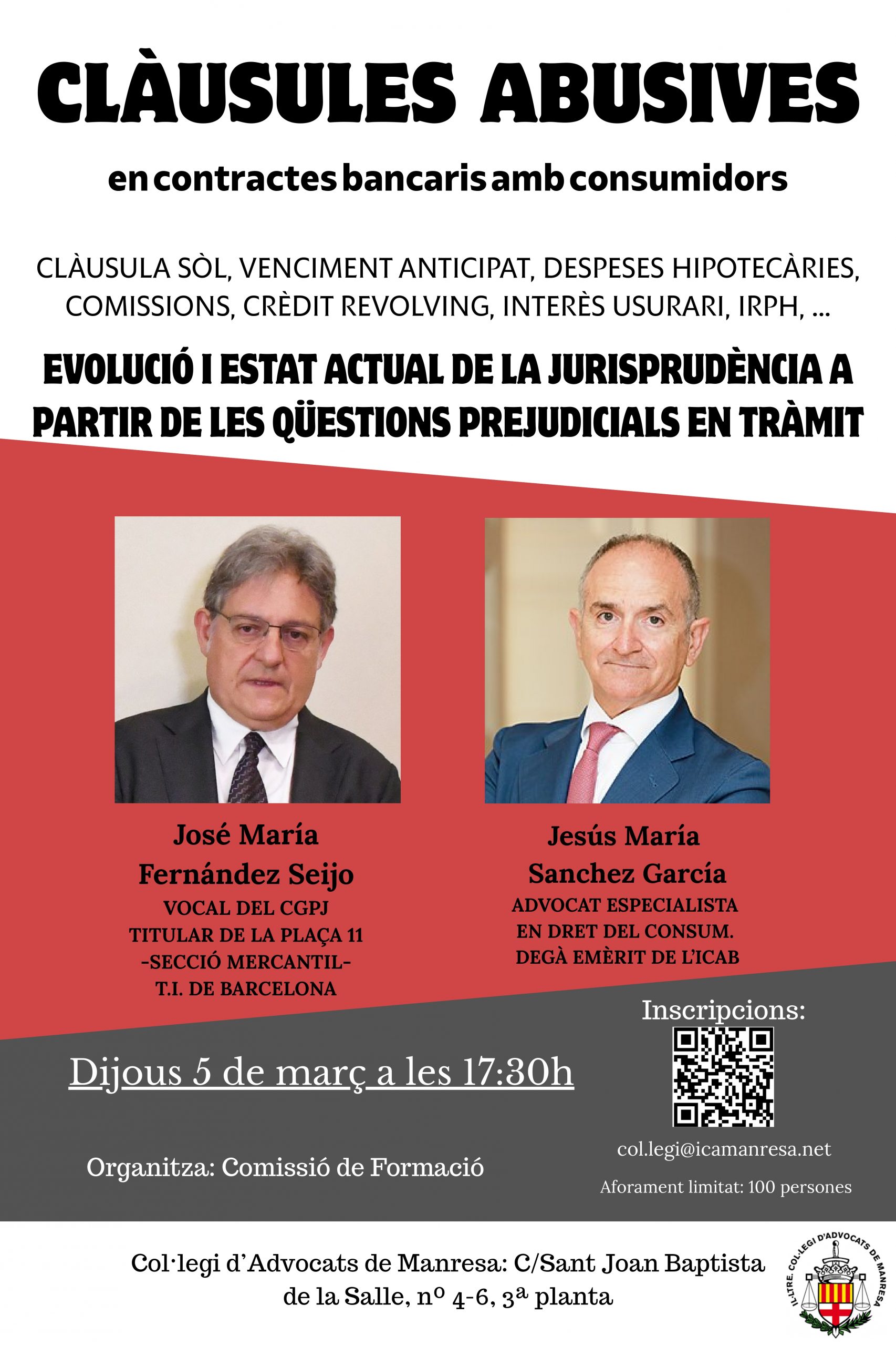 Format: Presencial a la Sala d’actes del Col·legi d’advocats de Manresa (C/ St. Joan Bpta. La Salle).