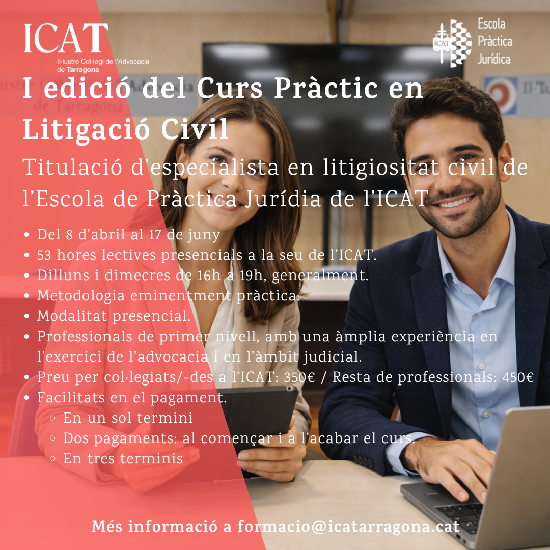 L’Escola de Pràctica Jurídica de l’Il·lustre Col·legi de l’Advocacia de Tarragona organitza la I Edició del Curs Pràctic en Litigació Civil, una formació eminentment pràctica adreçada a professionals de l’advocacia que vulguin aprofundir en les tècniques processals civils i millorar les seves habilitats en sala.